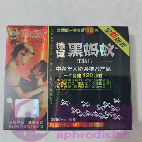 德國黑螞蟻生精片是香港天龍生物科技(國際)集團公司醫藥研究中心經過多年精心研究,中老年協會推薦產品-壹片持效120小時!2003年經臨床試驗成功後推岀市場的最新美國WG替代品,最佳挑戰者,能促進陰莖快速勃起增硬增粗、能有效解決性愛短暫、提升勃起硬度、防止早洩、延長性愛時間;而且能在人體內留存120小時,本品的純中藥製劑不會產生任何副作用及依賴性;沒有臉紅、心跳加速、噁心頭痛等反應,而且不受心髒病、高血壓、糖尿病的影響,是一款適合大部分男性的一款保養產品!